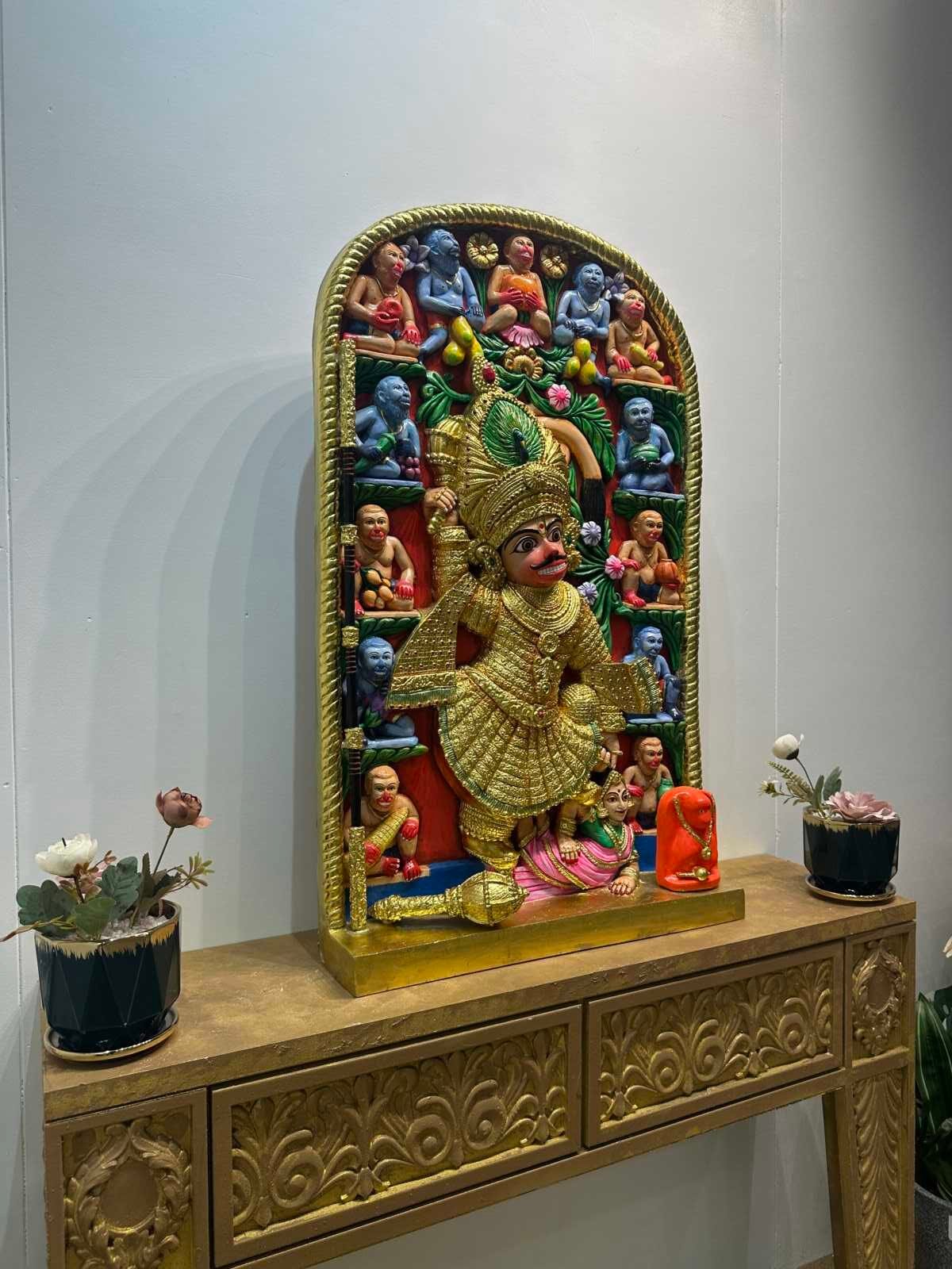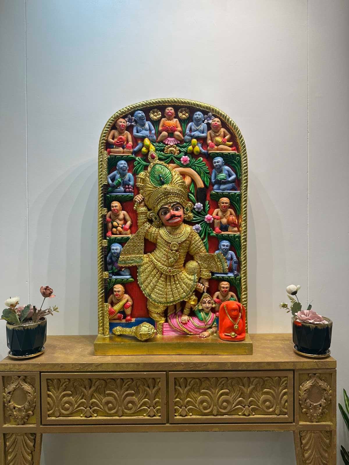 This is a Handcrafted Divine Heritage Art, inspired by SALANGPUR HANUMAN JI The artwork features powerful 3D detailing, vibrant colors, and intricate hand-carved textures that bring the dramatic form of SALANGPUR HANUMAN Ji to life. Every expression, ornament, and surrounding divine figure is carefully sculpted to reflect strength, protection, and spiritual awakening.Psychologically, the golden tones represent divine energy and prosperity, while the bold reds and blues evoke power, devotion, and inner stability. The layered textures create depth, realism, and a sacred aura that instantly transforms any space into a place of positivity and spiritual protection.Ideal for living rooms, prayer rooms, entrances, offices, studios, and luxury décor spaces, this artwork adds a majestic presence and a deeply spiritual vibration.