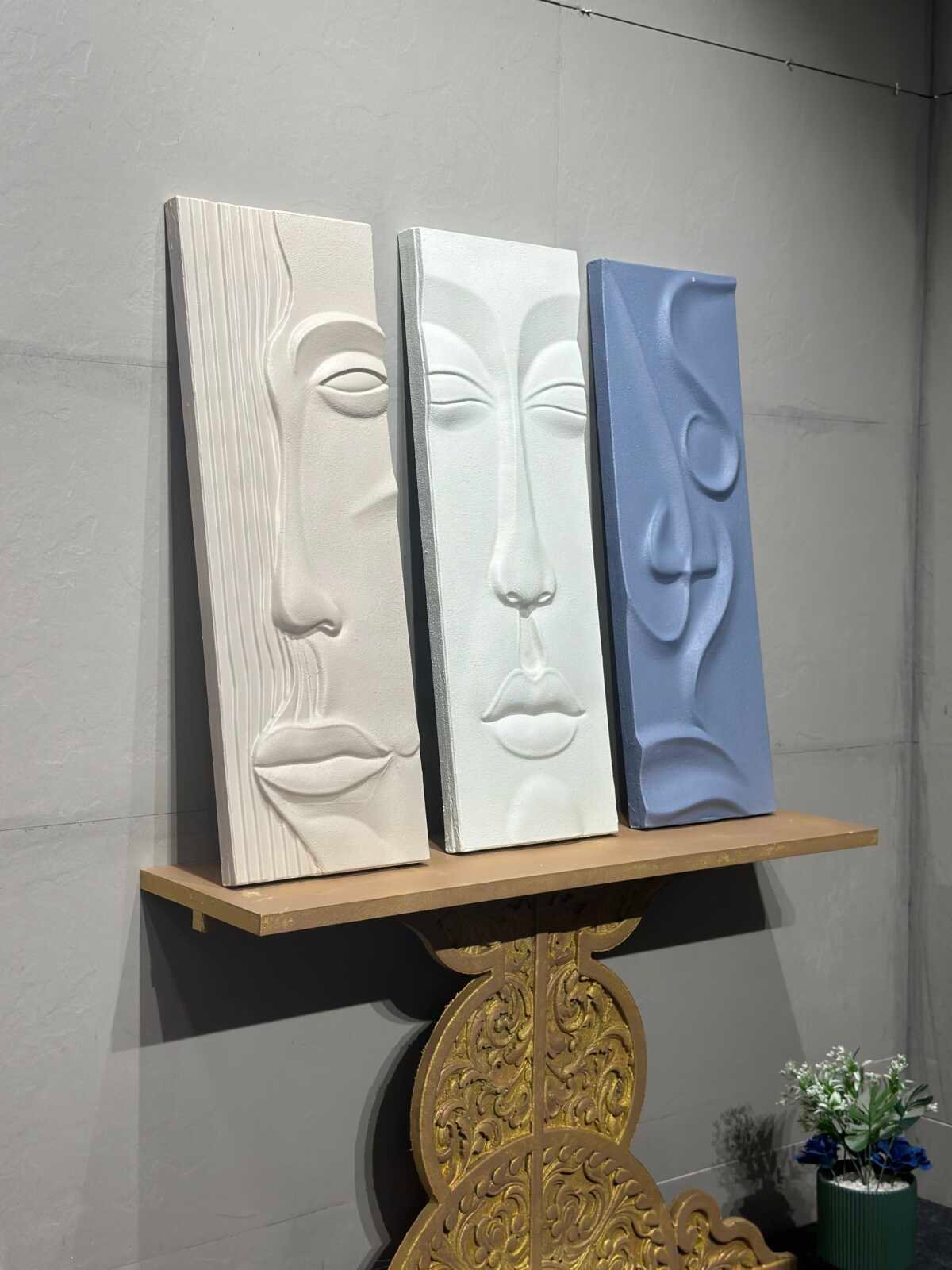 This is a Modern Sculpted Face Art Series, inspired by contemporary minimalism and abstract human expression. Each panel features a unique 3D face contour—soft curves, serene features, and smooth sculptural lines—crafted to evoke tranquility, introspection, and modern artistic identity.The muted tones of ivory, ice-white, and pastel blue create a calming palette symbolizing clarity, peace, and balanced emotion, while the sculpted texture brings depth, sophistication, and a museum-grade aesthetic. These artworks instantly elevate any space with their subtle drama and refined elegance, making them perfect for creating a premium, modern ambience.Ideal for living rooms, bedrooms, hallways, offices, studios, hospitality spaces, or any interior seeking luxury minimalism and contemporary art expression.