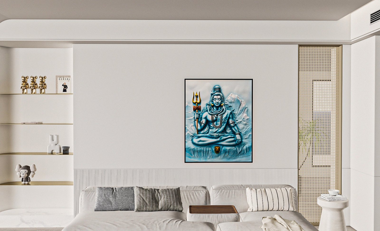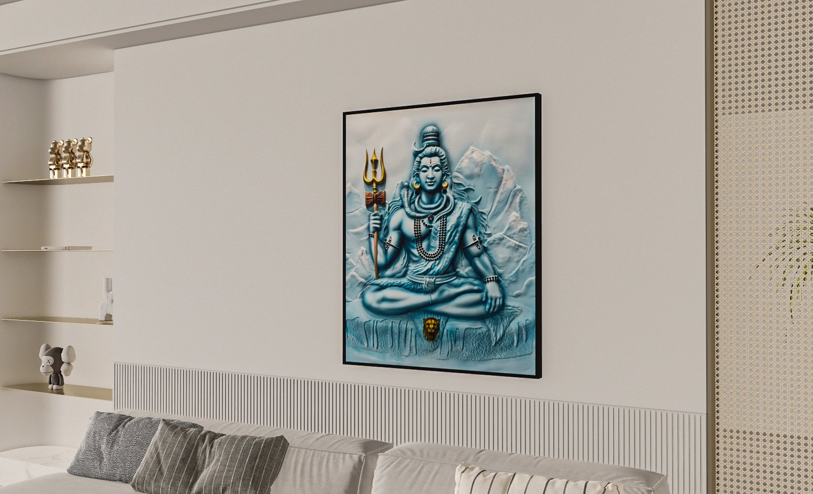 This is a Divine Shiva Serenity Art, inspired by the sacred calmness of Lord Mahadev meditating in the Himalayas, crafted with soothing blue tones and subtle 3D detailing. Psychologically, blue symbolizes peace, spiritual depth, and emotional healing, while the mountain backdrop represents strength, stability, and divine protection. The serene posture of Shiva radiates inner balance, positivity, and powerful yet calming energy that transforms the atmosphere of any space. This artwork is ideal for the living room, meditation area, entrance foyer, pooja space, bedroom, or office to bring spiritual grounding, mental clarity, and a sense of divine presence.