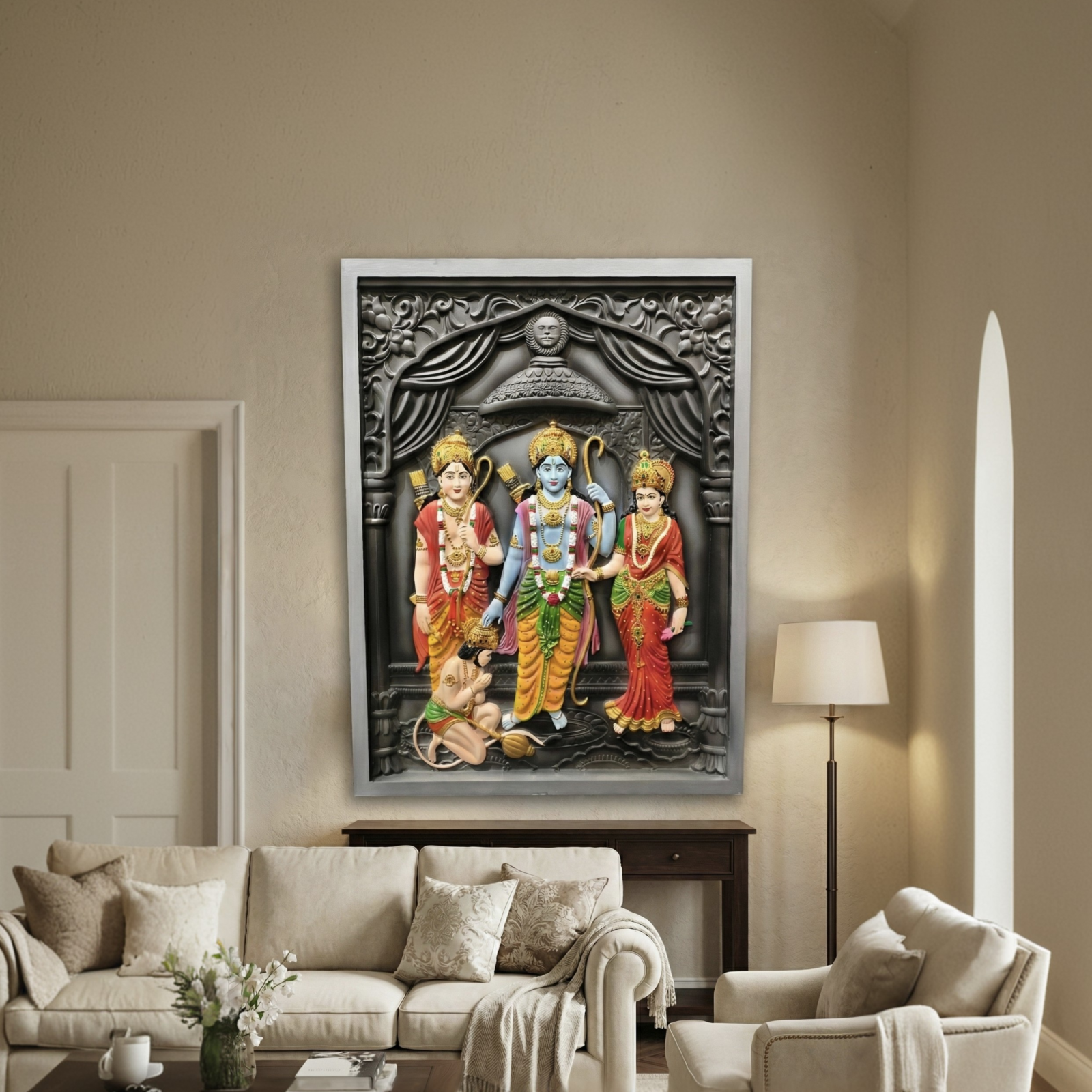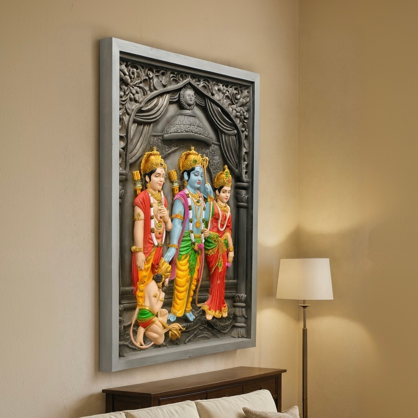 This is a Modern Divine Relief Art, inspired by traditional temple carvings and contemporary textured sculpture, crafted with intricate 3D detailing and a majestic architectural backdrop. Psychologically, the serene blue tones represent protection and harmony, while the vibrant reds and golds symbolize devotion, strength, and sacred energy. The beautifully sculpted figures and layered textures create depth, reverence, and a feeling of divine presence that instantly elevates the surroundings. This artwork is ideal for the living room, entrance foyer, meditation area, or puja room to bring blessings, positivity, and a spiritually enriched ambiance.