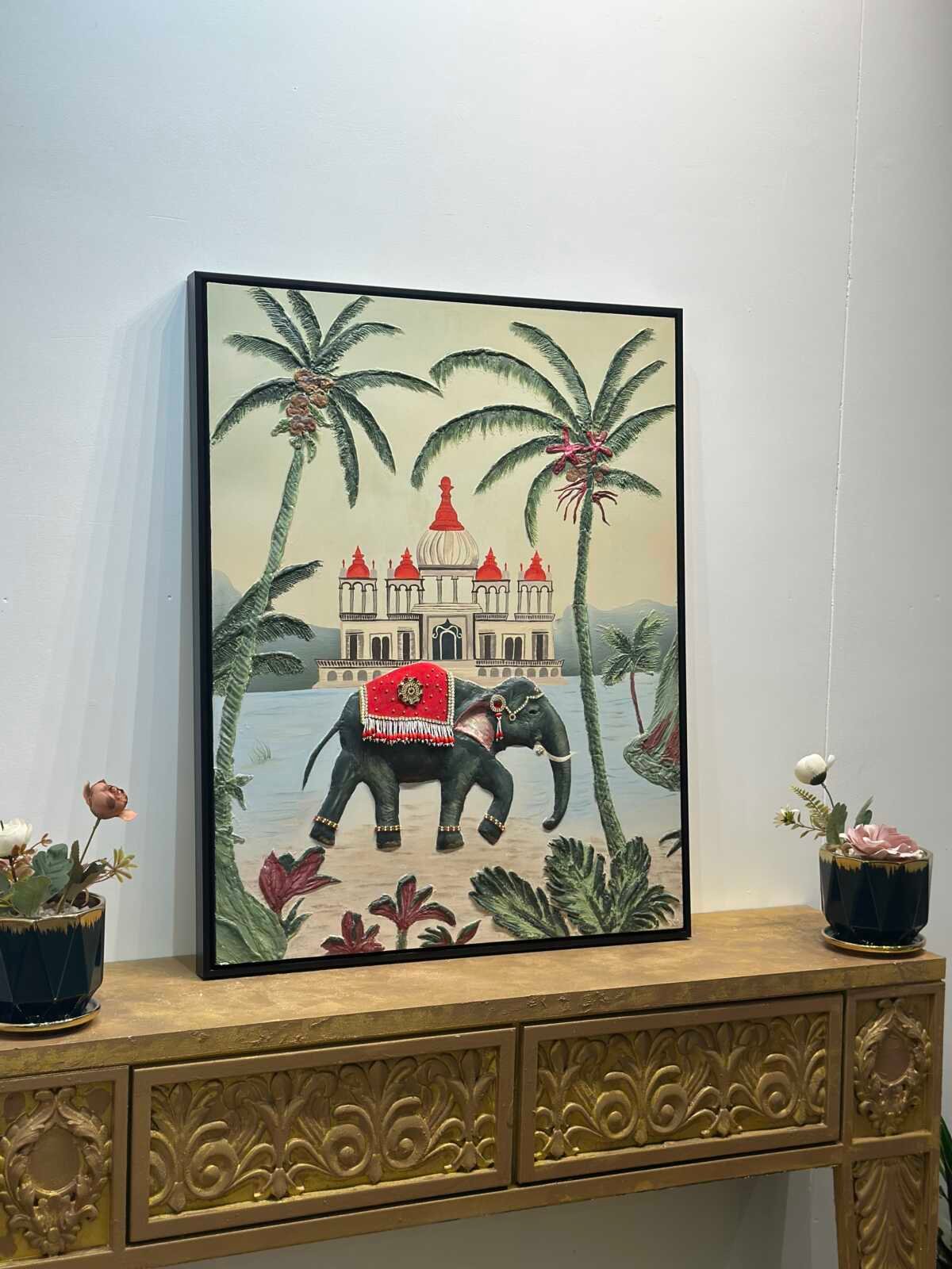 This is a Royal Heritage Elephant Art, inspired by classical Indian palatial architecture and the timeless symbolism of the majestic elephant. Crafted with textured botanical elements, detailed embellishments, and rich traditional motifs, the artwork blends cultural elegance with a serene tropical setting.The grand palace in the background evokes history, royalty, and architectural beauty, while the adorned elephant represents strength, wisdom, and auspicious energy. The lush palm trees and earthy tones add warmth, depth, and an inviting sense of exotic tranquility.This artwork instantly enriches any space with cultural richness, positivity, and refined luxury—making it ideal for living rooms, entrance foyers, hotels, offices, and curated interiors that celebrate heritage and sophistication.
