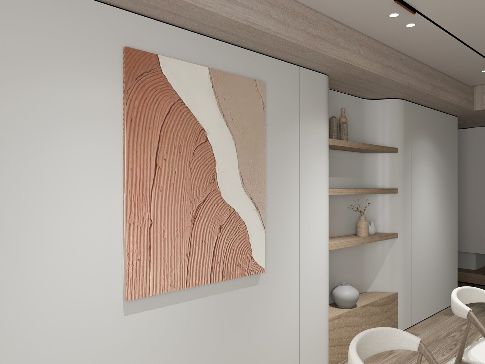 This is a Minimal Earth-Tone Abstract Art, inspired by natural canyon lines and soft desert curves, crafted with warm terracotta, nude beige, and a smooth flowing 3D texture.Psychologically, the earthy terracotta represents grounding, comfort, and emotional warmth, while the cream tones symbolize calm clarity and balance.The flowing shapes indicate harmony, effortless movement, and a peaceful life path.This artwork adds a luxurious organic feel and is ideal for the dining area, living room, bedroom, entrance foyer, or modern office to create a warm, soothing, and welcoming environment.