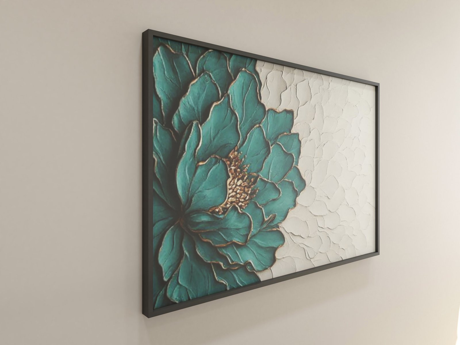 This is a Modern Textured Bloom Art, inspired by oversized floral forms and contemporary minimal sculpture, crafted with rich 3D petals and bold teal detailing.Psychologically, teal represents emotional balance, calmness, and creative clarity, while the white background symbolizes purity, peace, and fresh beginnings.The textured petals add depth, luxury, and a soft organic elegance that instantly uplifts the space.This artwork is ideal for the living room, bedroom, dining area, entrance foyer, or office to bring harmony, freshness, and a premium modern vibe.